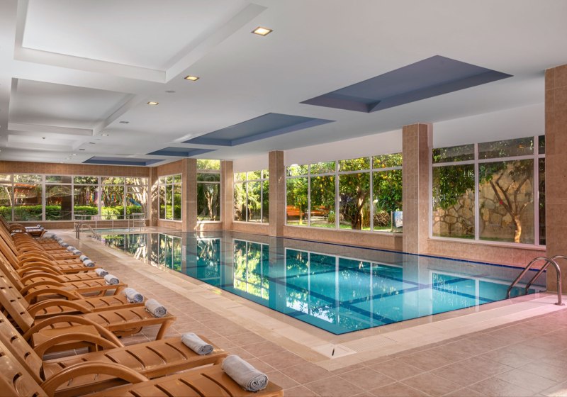 Wenn Ihr den Tag ruhig beginnen oder ausklingen lassen möchtet, wechselt Ihr vom Pool in den Innenbereich. Dort wartet ein Hallenbad als wetterunabhängige Alternative. Sauna, Dampfbad und das traditionelle türkische Bad (Hamam) ergänzen das Angebot – sachlich ausgestattet, funktional und nah an den Wegen der Anlage.