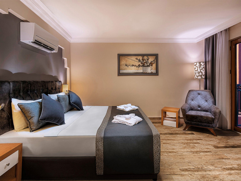 • Klimaanlage • Haartrockner • Minibar • Telefon • Safe • Schlafsofa • Fernseher (Sat-TV) • WiFi • Balkon oder Terrasse • Innenhofblick • Gartenblick • Poolblick • Schallisolation • Balkon (je nach Zimmerkategorie) • Kochnische • Terrasse