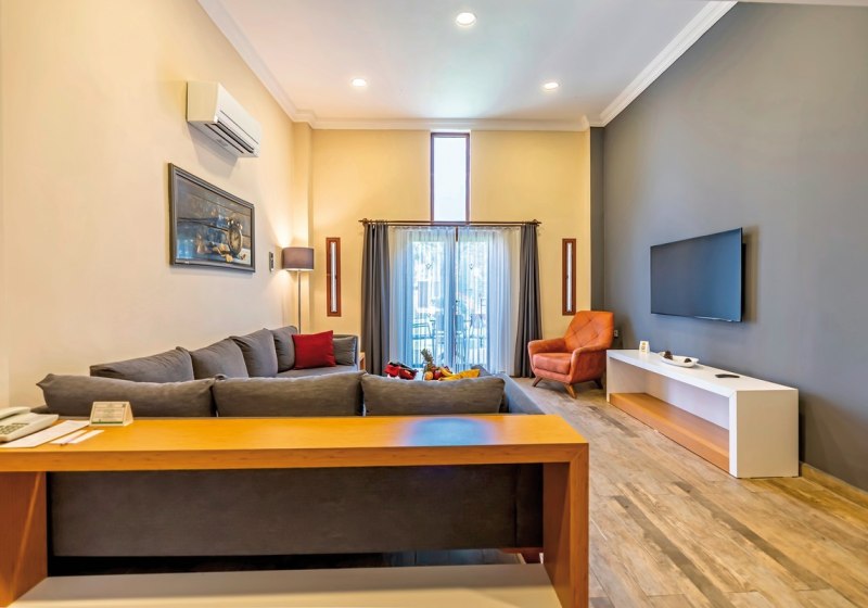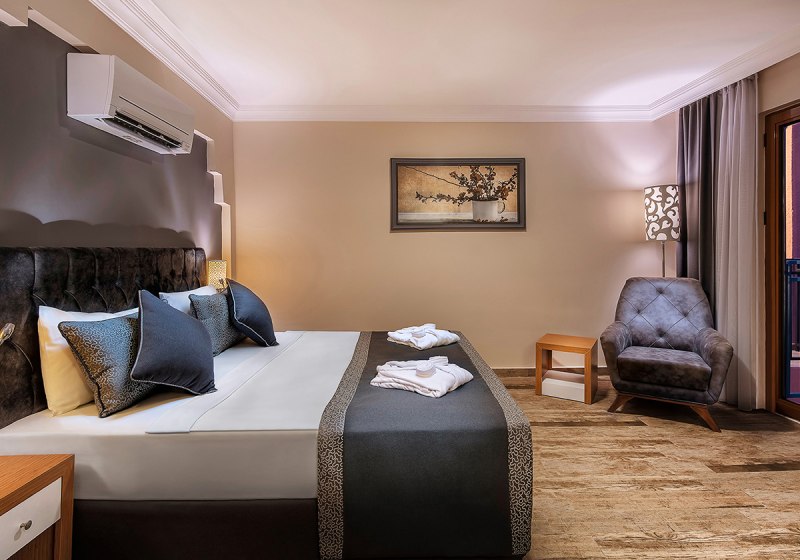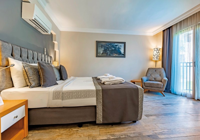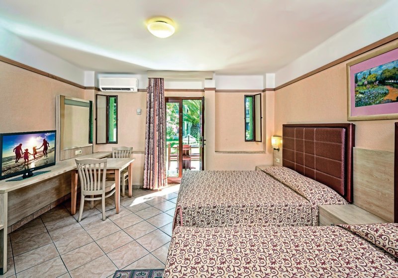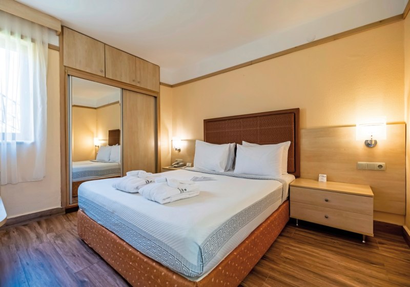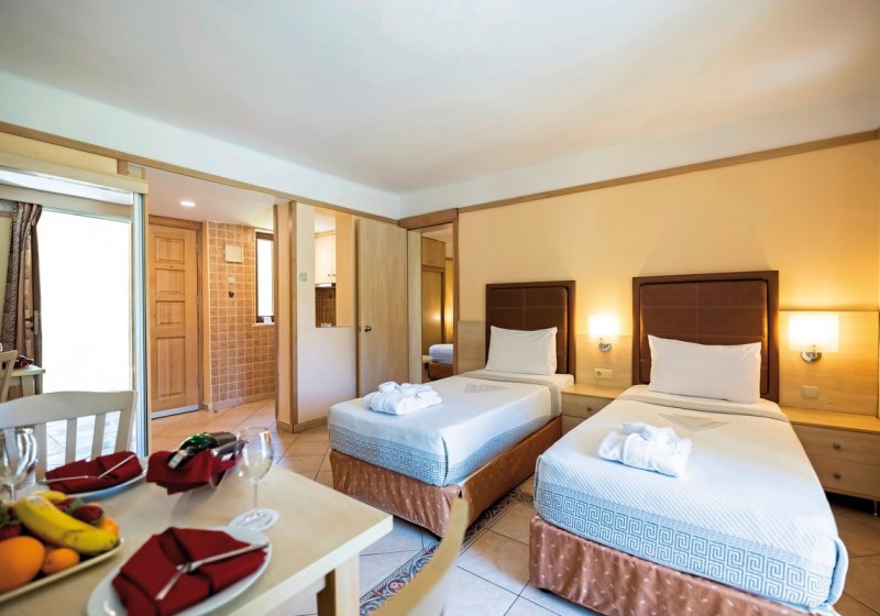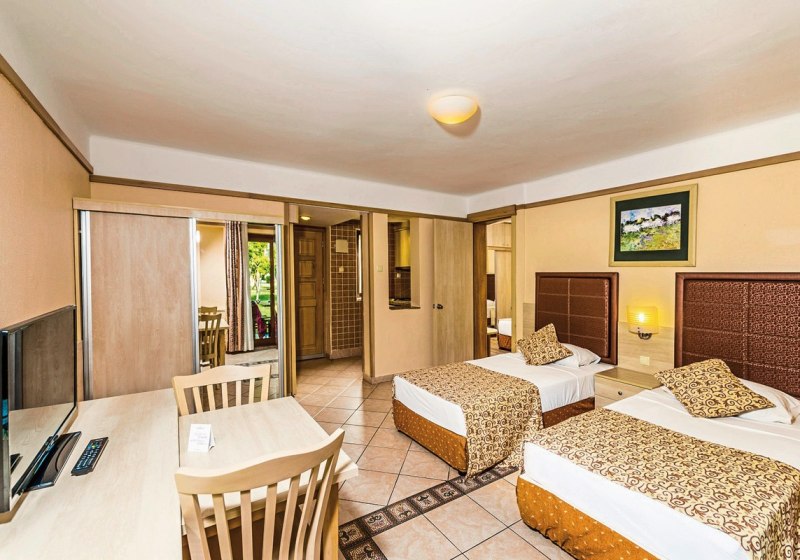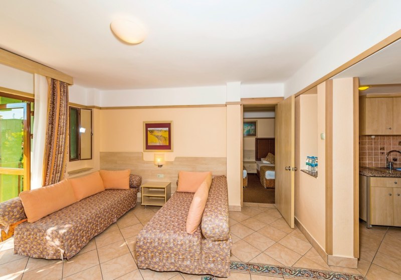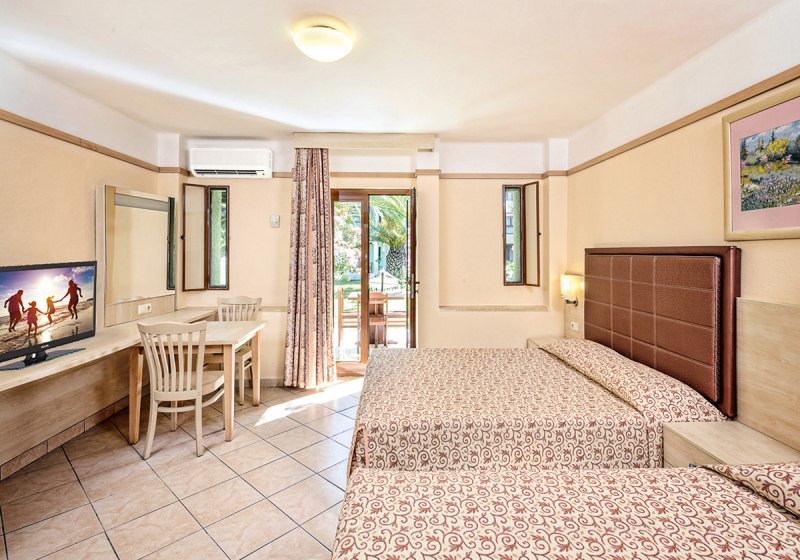 Ihr wählt zwischen Doppel- und Sparzimmern, Familienzimmern Typ A/B mit zwei Schlafräumen, Familiensuiten und Villen. Zur Grundausstattung zählen Dusche/WC, Föhn, Sat-TV, Safe, Direktwahl-Telefon, meist Minikühlschrank, individuell regulierbare Klimaanlage, Keramik- oder Laminatboden sowie Balkon oder Terrasse.