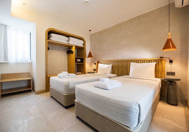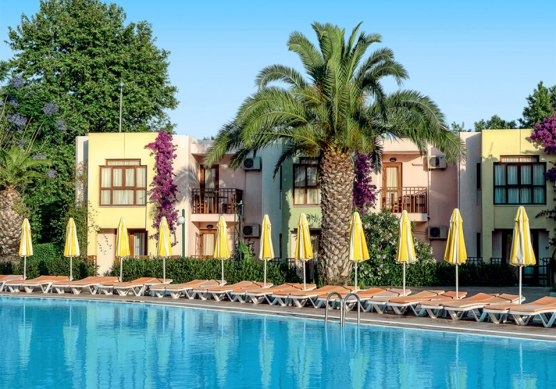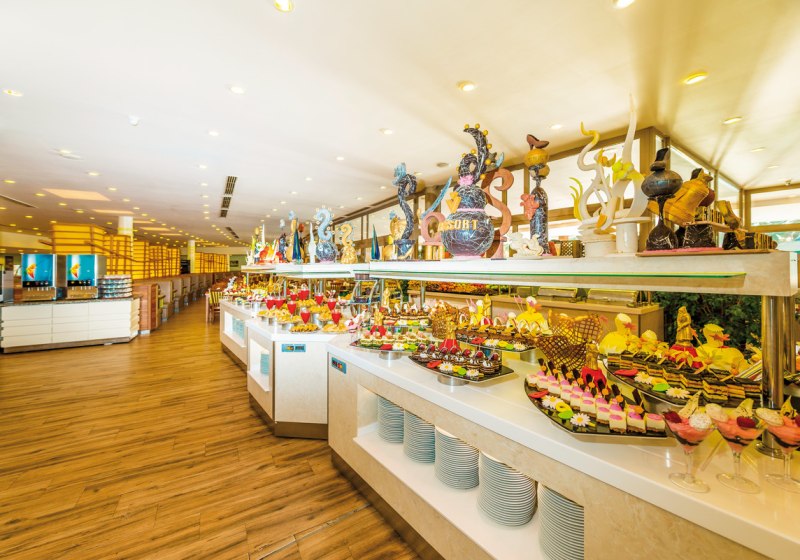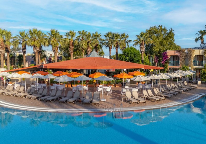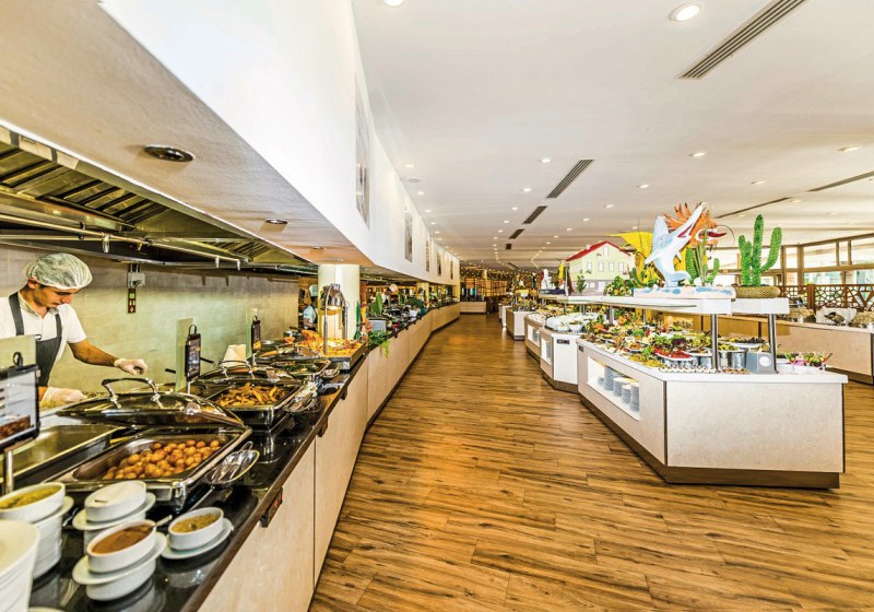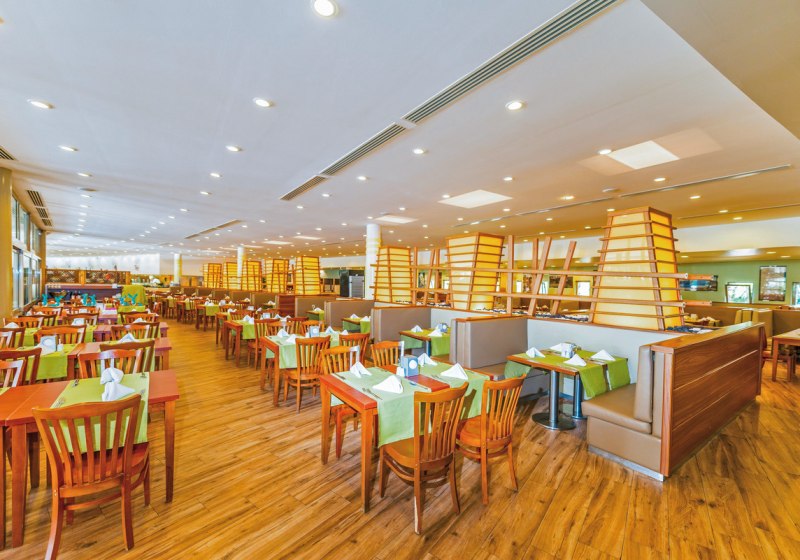 Familien findet Ihr hier ebenso gut aufgehoben wie Strandreisende: Miniclub, Spielplatz, Kinderbecken und der gemeinsame Aquapark mit 13 Wasserrutschen geben Energie, während der Fitnessraum, Boccia, Darts und Beachvolleyball Abwechslung schaffen. Kulinarisch erwartet Euch ein Hauptrestaurant mit Terrasse, À-la-carte-Optionen sowie mehrere Bars vom Lobbybereich bis an den Strand. WLAN in der Lobby ist inklusive.