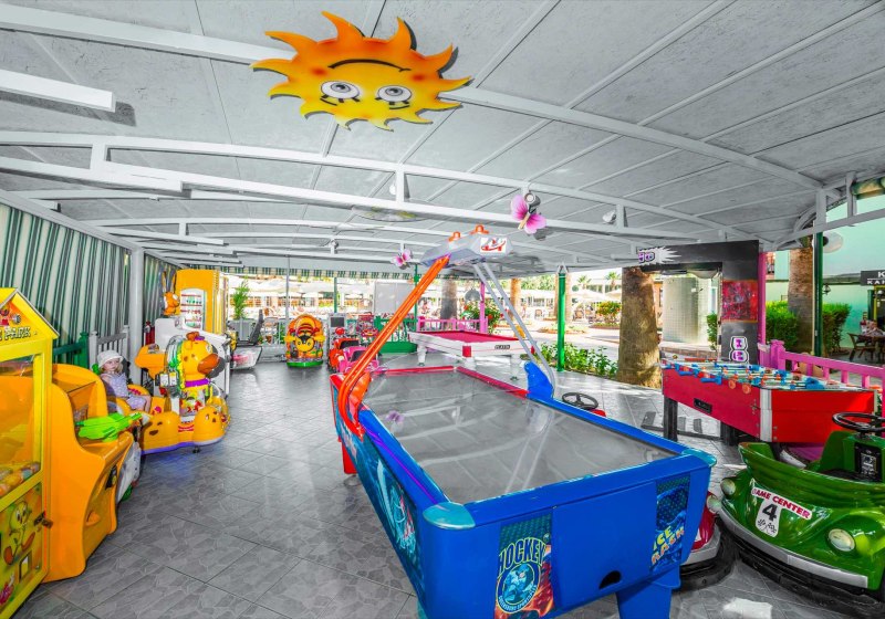 Spiel- und Aufenthaltsbereiche ergänzen die Infrastruktur: Miniclub, Spielplatz, Gamecenter und Billard treffen auf ruhige Sitzinseln. Der gemeinsame Aquapark mit 13 Rutschen sorgt für Tempo, während Ihr zwischen Strand und Pool Euren Rhythmus findet. Die Rezeption und der Service sind zentral erreichbar.
