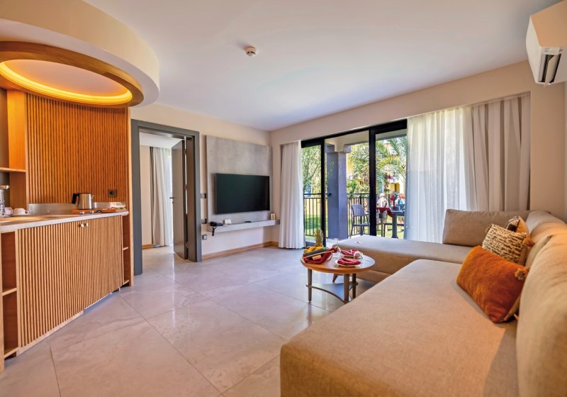Die Familiensuite misst etwa 62 Quadratmeter, bietet zwei Schlafzimmer, einen Wohnraum und eine kleine Küchenzeile mit Balkon oder Terrasse. Die Villa erstreckt sich über zwei Etagen mit drei Schlafzimmern, Wohnraum und zwei Duschen. Babybetten erhaltet Ihr auf Anfrage. Der Blick variiert je nach Lage innerhalb der Garten- und Poolbereiche.