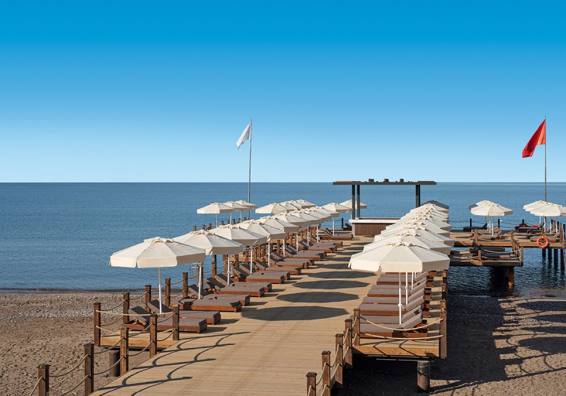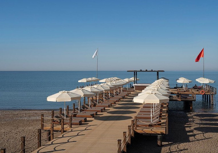Ihr wohnt in Belek an der türkischen Riviera, direkt am Sand‑Kiesstrand. Das Zentrum von Belek erreicht Ihr nach rund 2 km, Antalya liegt etwa 45 km entfernt. Ein Golfplatz befindet sich in rund 1.000 m Entfernung, der Flughafen Antalya in etwa 35 km. So kombiniert Ihr Strandnähe mit guter Anbindung.