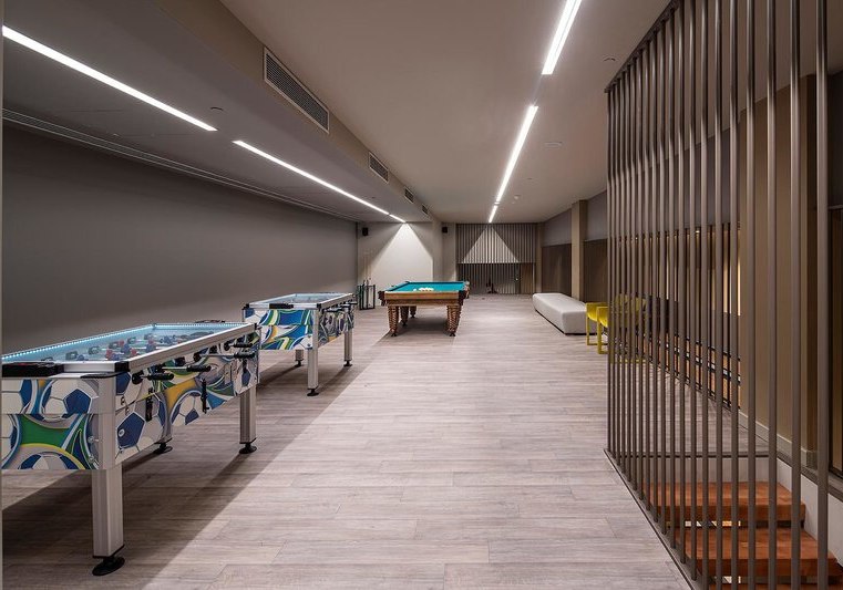 Die Anlage öffnet sich mit einer großzügigen Empfangshalle, WLAN in allen Bereichen und einer Einkaufspassage mit Friseur und zusätzlichen Services. Mehrere Konferenzräume und ein Let’s‑Play‑Spielraum erweitern die Nutzung. Die parkähnliche Gartenanlage führt Euch an neun Außenpools entlang bis zum Strand mit zwei Stegen.