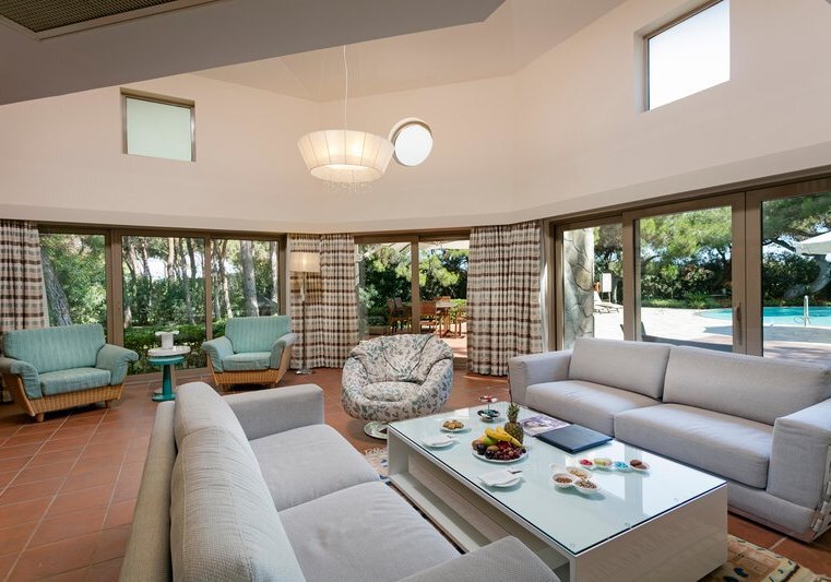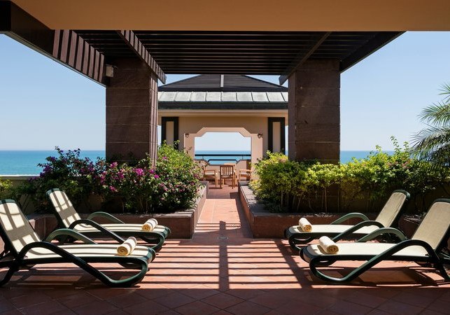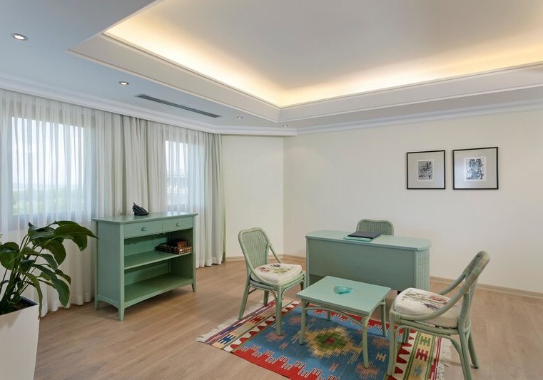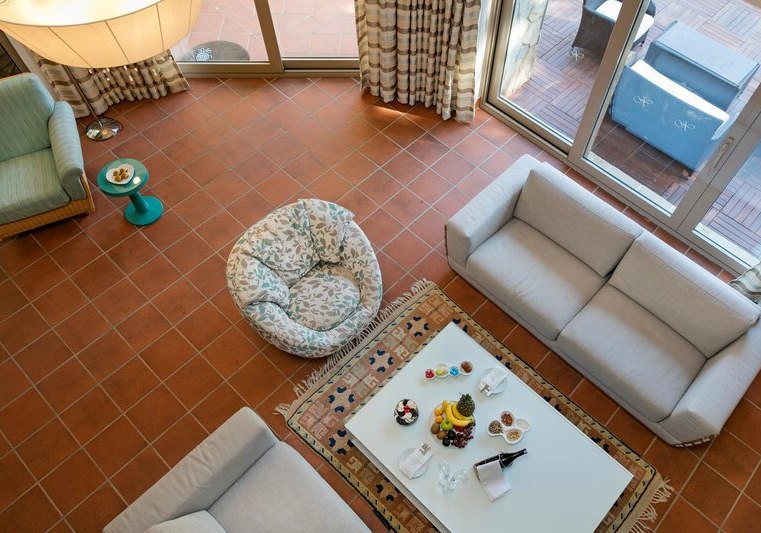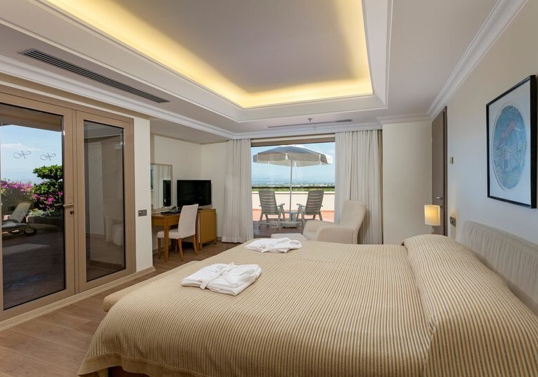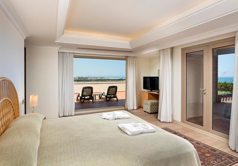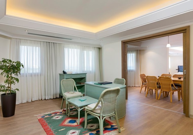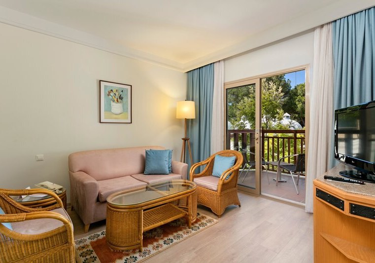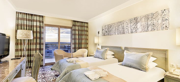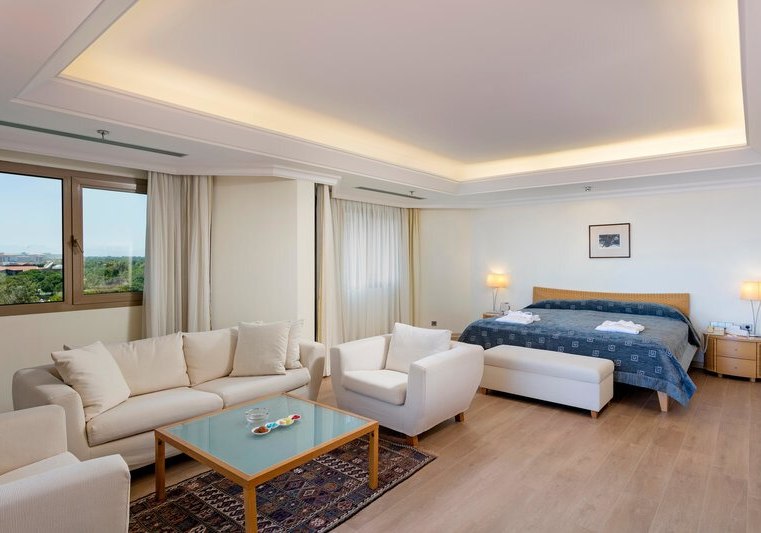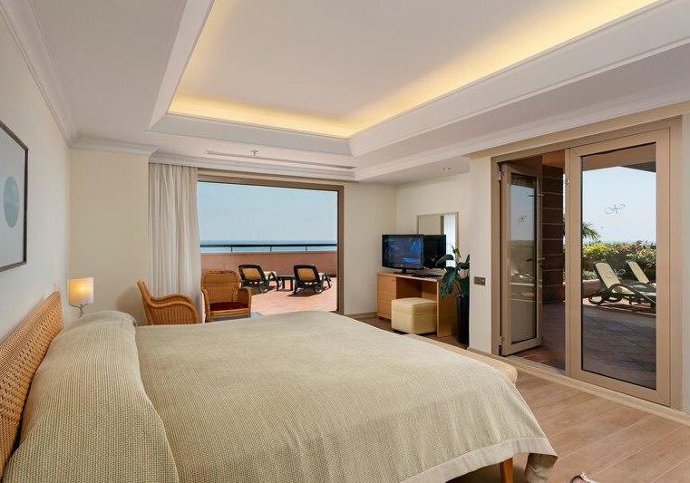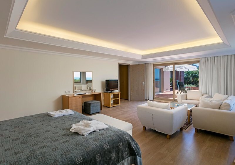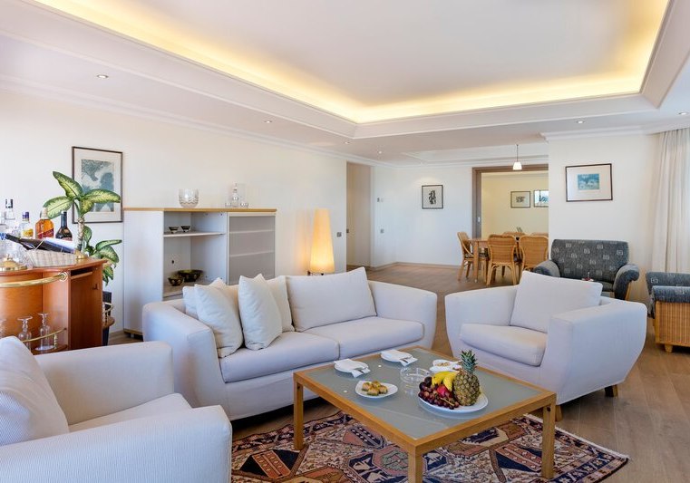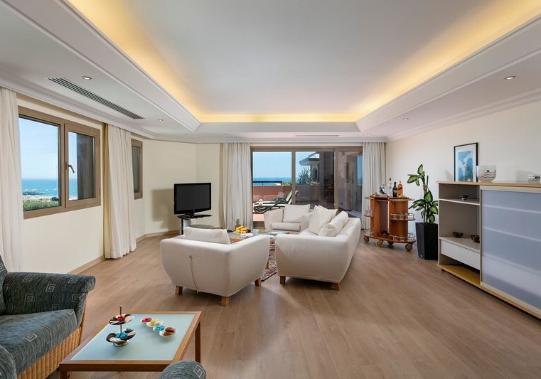Für mehr Raum stehen Juniorsuiten mit Wohnbereich und separatem Schlafzimmer bereit, der Balkon ist mit Liegen ausgestattet. Familienzimmer Typ A bieten zwei Schlafzimmer mit Verbindungstür und ein Bad, Typ B zwei Schlafzimmer und zwei Badezimmer. Zimmer mit Garten- oder Meerblick sind buchbar. Highlight: Familienlogik – klare Aufteilung mit zwei Schlafzimmern und Bädern.