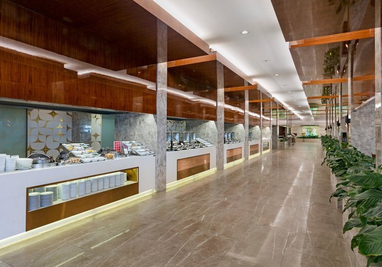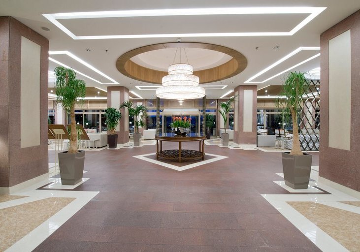 Das Haupthaus mit vier Etagen und vier Panoramaaufzügen bildet das Zentrum. Zwölf Bungalowgebäude und 421 Zimmer verteilen die Gäste angenehm. Lobby mit Rezeption, Businesscenter, Konferenzräume und eine Geschäftsarkade schaffen klare Strukturen. WLAN ist in der Anlage und in den Zimmern verfügbar. Highlight: Klare Infrastruktur – zentrale Lobby und kurze Wege.