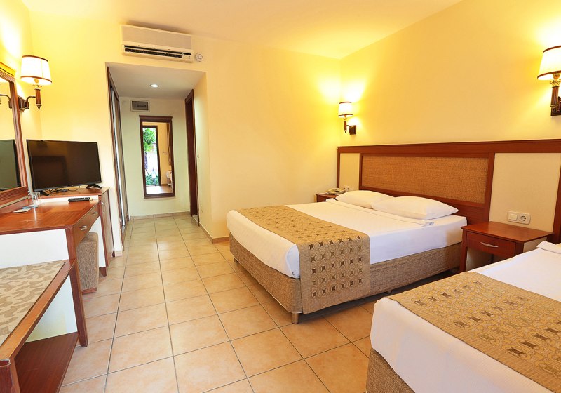 Für zusätzlichen Komfort stehen in den Zimmern je nach Kategorie Internetzugang/WiFi, Schreibtisch und Minikühlschrank bereit. Zustellbetten sowie Optionen mit getrennten Schlafzimmern sind ausgewiesen. Das Design bleibt funktional, der Blick geht in Gartenbereiche oder Richtung Anlage – ideal für kurze Wege zwischen Zimmer, Terrasse und Strand.
