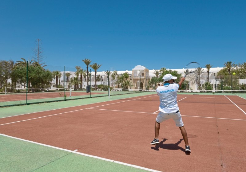 Aktive finden im Dar Jerba - Narjess ein breites Programm: Drei Tennisplätze setzen den markanten Akzent, ergänzt durch Fitness-Studio, Aerobic, Gymnastik und Aqua-Fitness. Ball- und Präzisionssport bringen Abwechslung – von Basketball und Volleyball über Tischtennis bis zu Boccia, Darts, Billard und Minigolf. So bleibt Ihr zwischen kurzen Einheiten und ambitionierten Matches flexibel.