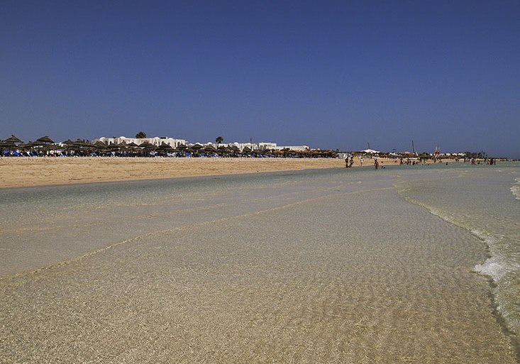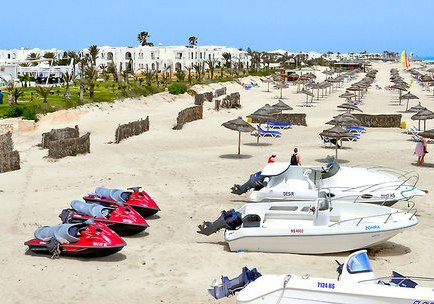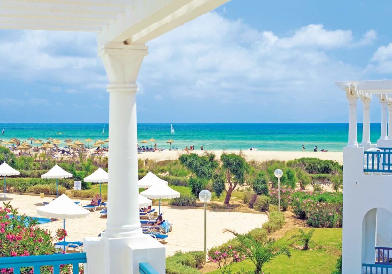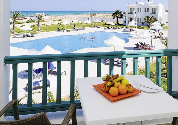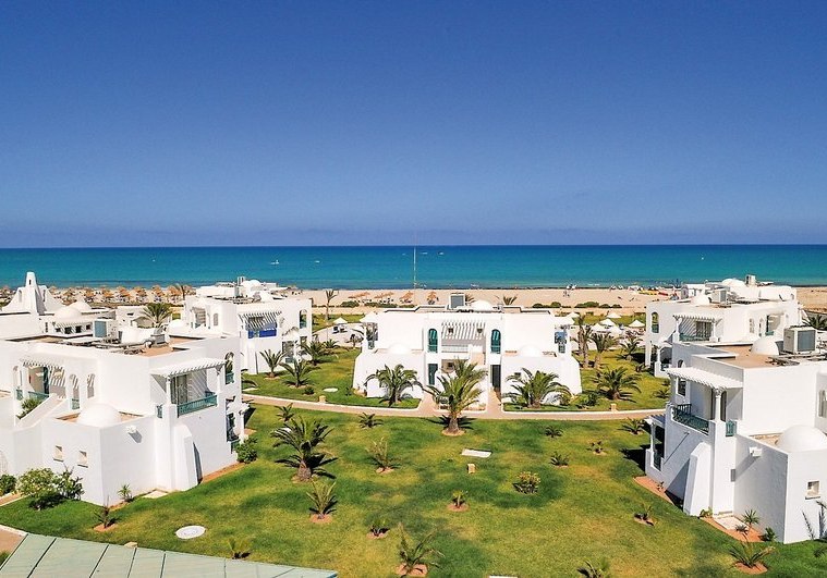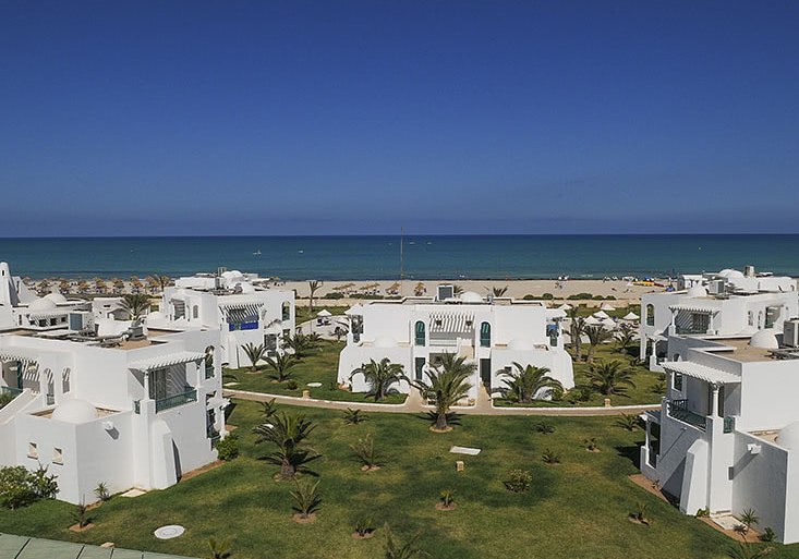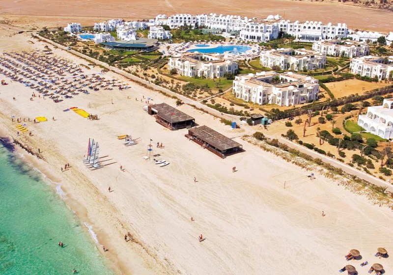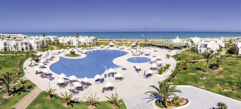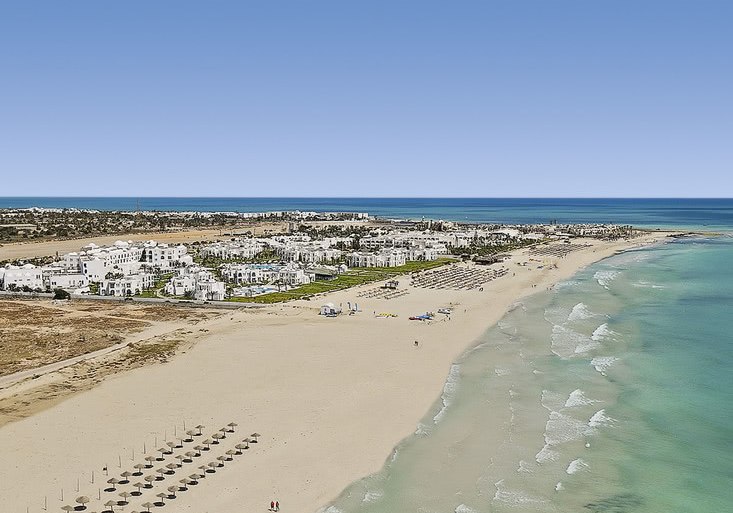 Ihr residiert auf Djerba direkt am Sandstrand; der Blick geht über flaches Küstenland und das Meer. Bis Houmt Souk sind es rund 25 Kilometer, der Flughafen liegt etwa 32 Kilometer entfernt. Das Gelände umfasst ca. neun Hektar, die Wege bleiben dabei übersichtlich und gut strukturiert.