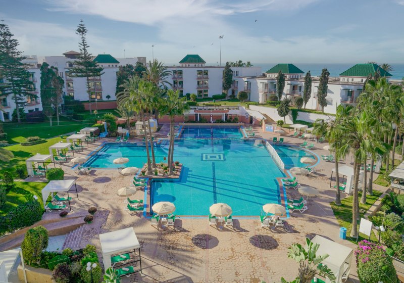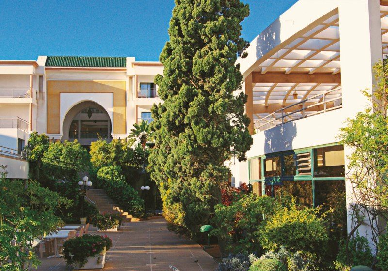 Im Agadir Beach Club Hotel wohnt Ihr direkt an der Strandpromenade von Agadir – mit privatem Strandabschnitt, weitläufiger Gartenanlage und beheizbarem Außenpool für die kühleren Monate. Das Ensemble aus Haupt- und Nebengebäuden wirkt großzügig, die Wege sind klar, die Atmosphäre lebendig und entspannt zugleich – ideal für Strandurlauber.