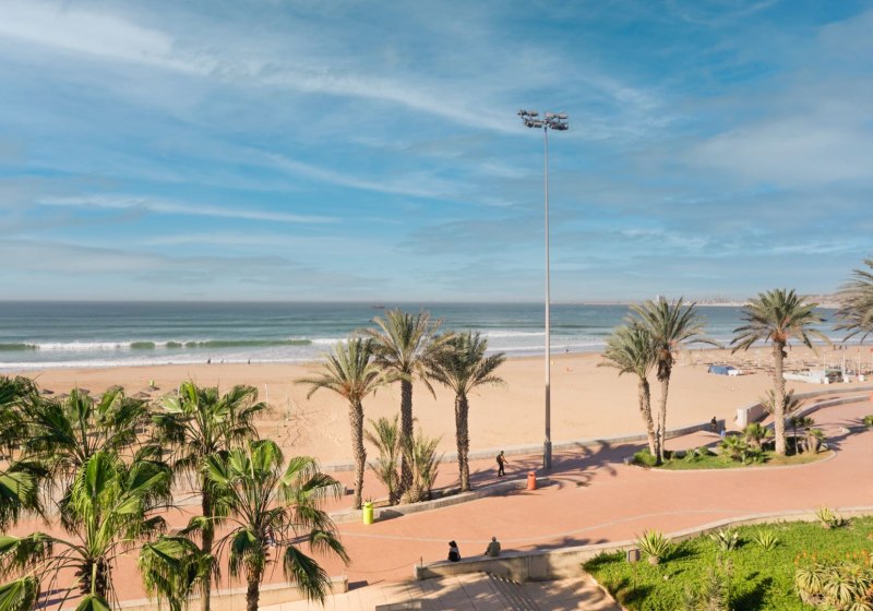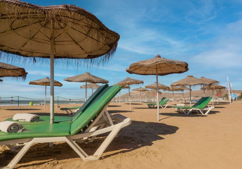 Ihr wohnt in Agadir direkt an der Strandpromenade – der feinsandige Abschnitt liegt nur durch die Promenade getrennt vor Euch, inklusive privatem Strandteil mit Liegen und Schirmen. Das Zentrum erreicht Ihr nach etwa einem Kilometer, zur Marina sind es rund zwei Kilometer, der Flughafen liegt etwa 25 Kilometer entfernt.