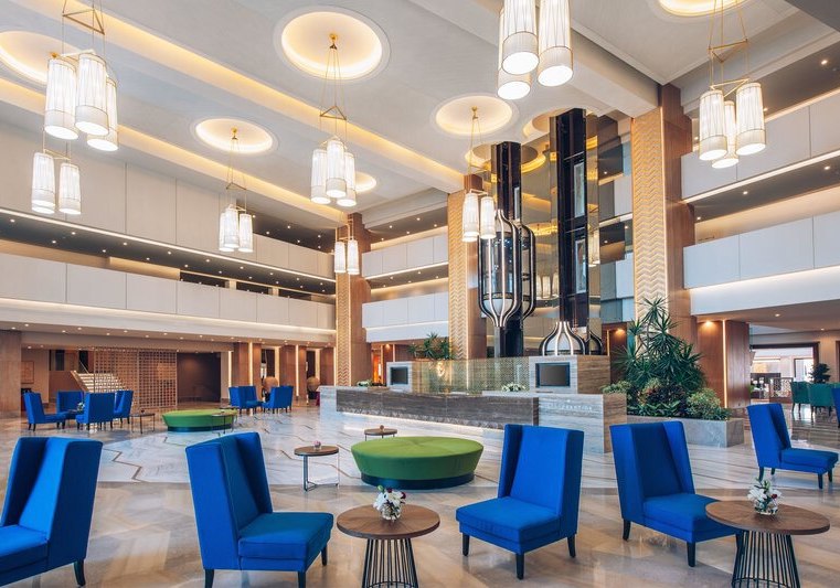 Die öffentlichen Bereiche wirken klar gegliedert: Rezeption, Lobbybar und Shops, dazu Gartenflächen und Sonnenterrassen. WLAN ist im gesamten Hotel kostenfrei. Drei Außenpools, Kinderpool, Wasserrutschen und Wasserspielplatz geben Struktur für aktive Tage, Handtücher, Liegen und Sonnenschirme sind organisiert. Highlight: Star-Prestige-Areal mit Chill-out-Terrasse und Jacuzzi.
