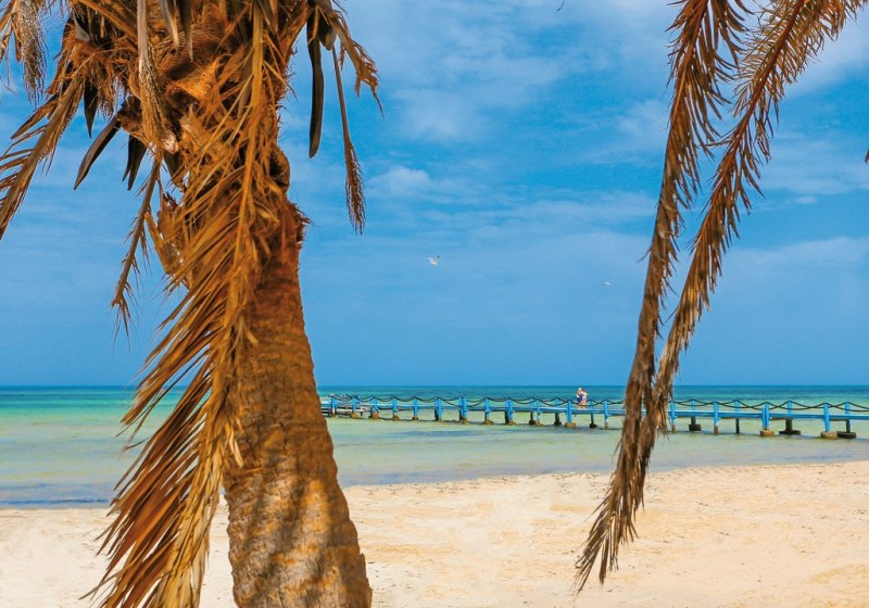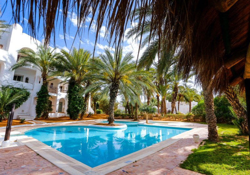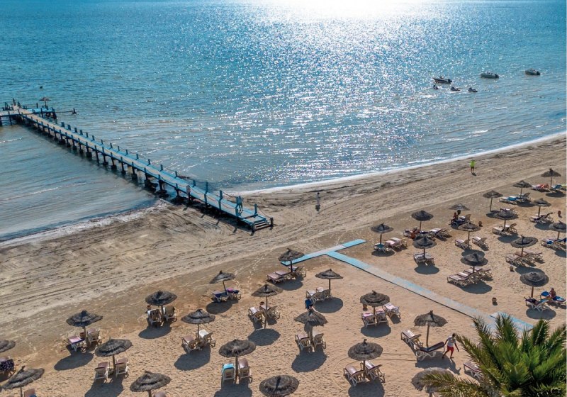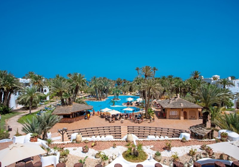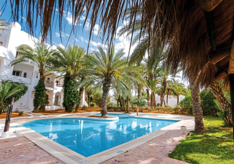 Ihr wohnt direkt am Sandstrand der Oase Zarzis, mit weitem Blick und kurzen Wegen zum Meer. Bis nach Zarzis sind es etwa 14 Kilometer, der Flughafen Djerba liegt rund 50 Kilometer entfernt. Die Strandlage prägt den Tag: Sonnenstunden am Wasser, Spaziergänge am Ufer, danach bequem zurück in die Anlage.