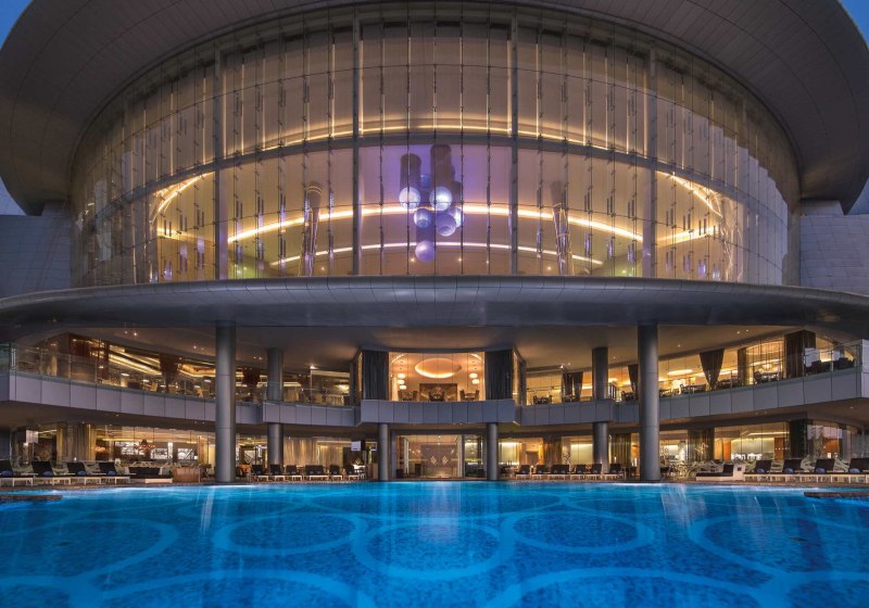 Die Infrastruktur ist großstädtisch und klar organisiert. Drei Außenpools, private Strandzone mit Liegen, Badetüchern und Sonnenschirmen sowie Poolbar und Sonnenterrassen strukturieren den Tag. Indoor unterstützen Lobbyzonen, Café und Bars die entspannte Taktung. Für Geschäftliches oder Events stehen Business-Center, Konferenzräume und Bankettsaal bereit; der Concierge koordiniert Details.