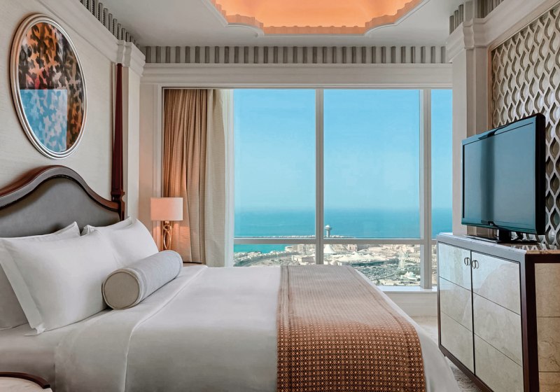Mit 283 Zimmern und Suiten auf den Etagen 33 bis 49, kostenfreiem WLAN im gesamten Hotel und 24-Stunden-Rezeption wirkt The St. Regis Abu Dhabi klar organisiert. Der private Beachclub Nation Riviera ist über eine klimatisierte Unterführung erreichbar. Eine weitläufige Poollandschaft mit Kinderpool, Liegen, Sonnenschirmen und Badetüchern strukturiert den Tag am Wasser.