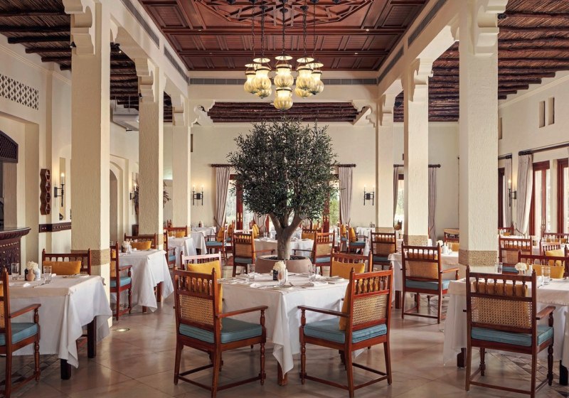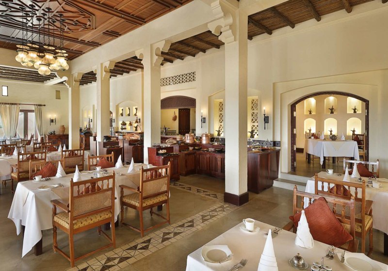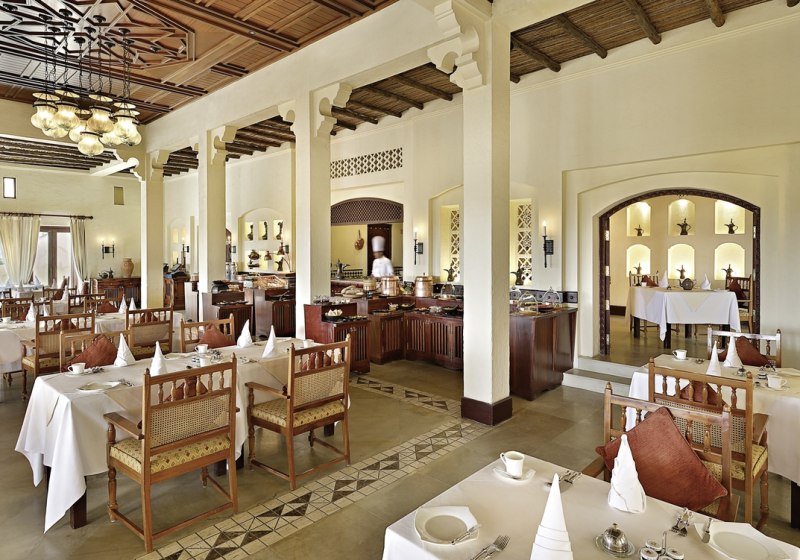 Im Restaurant Al Diwaan esst Ihr mit Blick auf die Landschaft. Die Küche wird in den Bewertungen als stark eingeschätzt; serviert werden Menüs, die den Rahmen eines Fünf-Sterne-Resorts spiegeln. Ergänzend bietet die Hajar Terrace Bar Drinks und leichte Bissen in luftiger Szenerie.