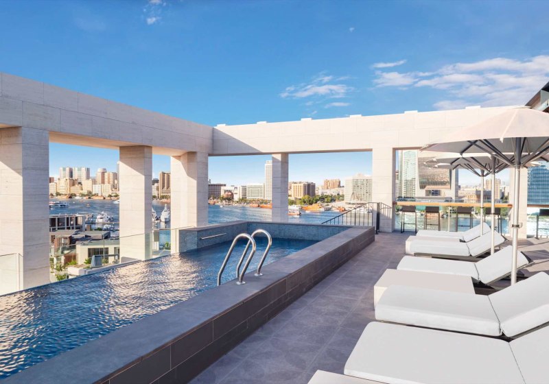 Als Adresse für City-Entdecker, Designfreunde und Geschäftsreisende spielt das Haus seine Lage aus: morgens am Wasser starten, mittags durch Al Seef schlendern, abends den Creek als Kulisse. 198 Zimmer und Suiten geben Eurem Aufenthalt verlässlichen Rahmen, das Fitnesscenter und der Infinity-Pool bringen Ausgleich. Kulinarisch wechselt Ihr von All-Day-Dining zu mediterranen Uferplätzen oder einer lässigen Sky-Bar am Pool.