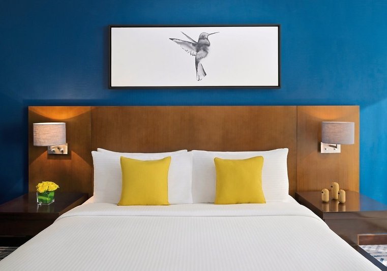 - Weitblick: Panoramafenster holen die urbane Kulisse ins Zimmer.