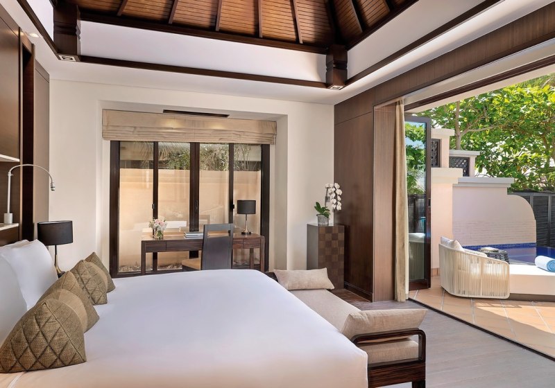 Im Anantara The Palm Dubai Resort wohnt Ihr auf dem äußeren Bogen von The Palm Jumeirah, mit Blick auf Wasserflächen, Lagunen und einen privaten Sandstrand. Die weitläufige Anlage verbindet Resortgefühl mit ruhigen Rückzugsorten – vom Infinity-Pool bis zu separaten Lagunen. Highlight: Über dem Meer erbaute Wasservillen setzen ein markantes Akzentuierungsstück.