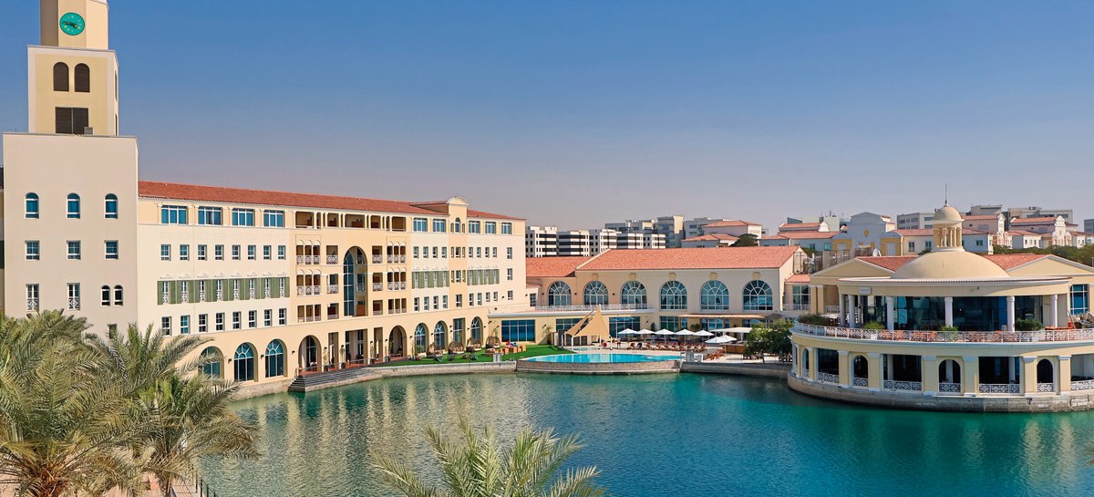 Im Millennium Lakeview Hotel wohnt Ihr in Dubais Green Community Village direkt am Ufer eines künstlich angelegten Sees. Die ruhige Umgebung prägt den Aufenthalt: klare Sichtachsen, Wasser vor der Tür, strukturierte Wege zwischen Gartenflächen und Poolbereich. Das Haus trägt die offizielle Landeskategorie von 4 Sternen und bietet 165 Wohneinheiten, betreut von englisch- und arabischsprachigem Personal.