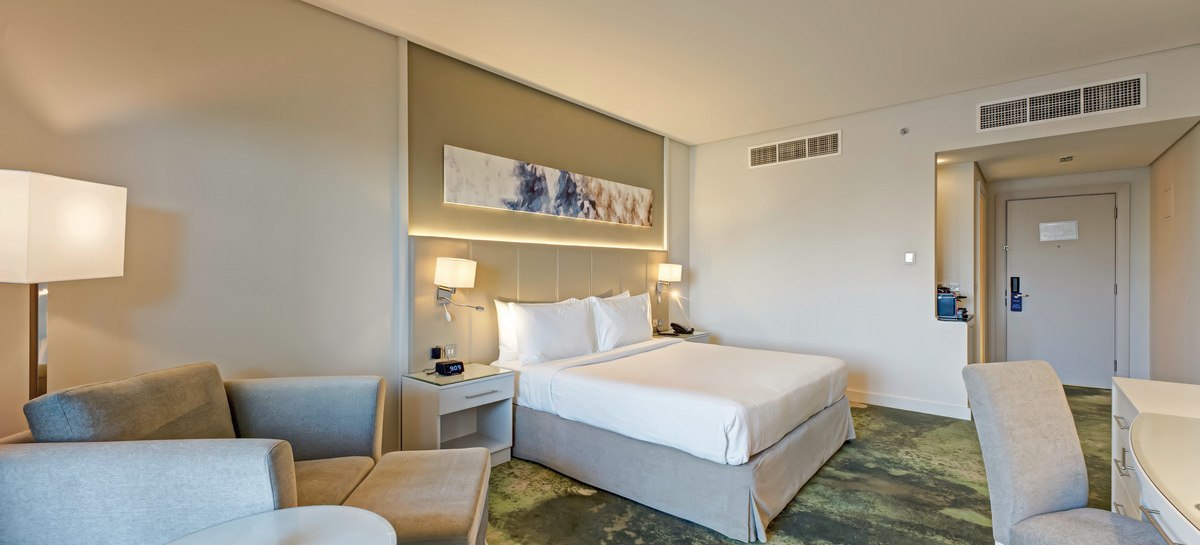Die Zimmer messen etwa 31 bis 35 Quadratmeter und bieten Stadt- oder Seeblick. Ihr schlaft in King- oder Twin-Betten, arbeitet am Schreibtisch und genießt die Klimaanlage. TV und WLAN verbinden Unterhaltung und Information, der Safe bewahrt Wertesachen, Kaffee- und Teezubereiter stehen bereit.