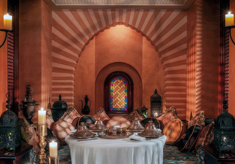 Mehrere Restaurants, Bars und Lounges strukturieren Eure kulinarischen Tage. Ihr wählt zwischen mediterraner, asiatischer, indischer, marokkanischer und internationaler Küche. Zu den Adressen zählen The Beach Bar & Grill, The Rotisserie, Tresind, Eauzone und Tagine – jeweils mit klar erkennbaren Küchenhandschriften.