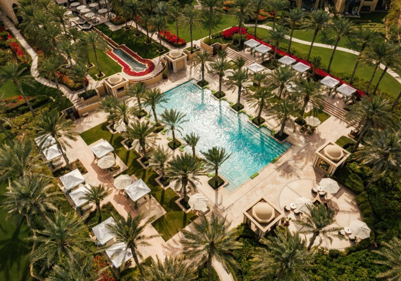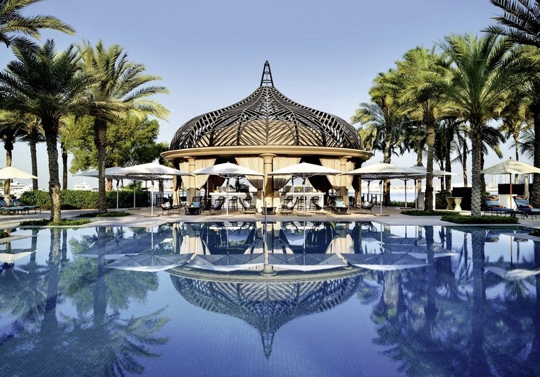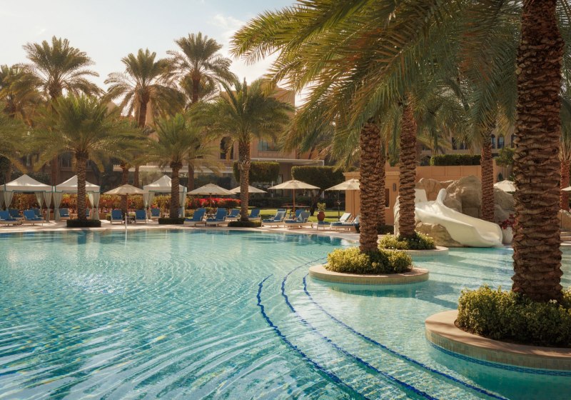 Das Resort gliedert sich in The Palace, Arabian Court und The Residence. Vier temperaturgeregelte Außenpools verteilen die Gäste angenehm, am Strand und an den Pools erwarten Euch Liegen, Schirme und Badetücher. Die öffentlichen Bereiche wirken großzügig, mit Gärten, Lounges und direktem Bezug zum Wasser.