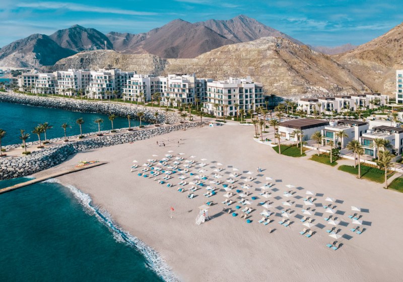 Ihr residiert direkt am hoteleigenen Sandstrand, eingerahmt vom Hajar-Gebirge und mit Blick auf den Indischen Ozean. Diese Lage verbindet kurze Wege ins Wasser mit der markanten Bergsilhouette. Bis zum Flughafen Dubai (DXB) sind es etwa 150 Kilometer, eine Distanz für planbare An- und Abreisen mit verlässlicher Orientierung.