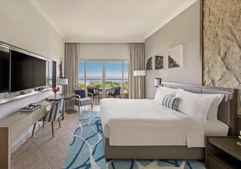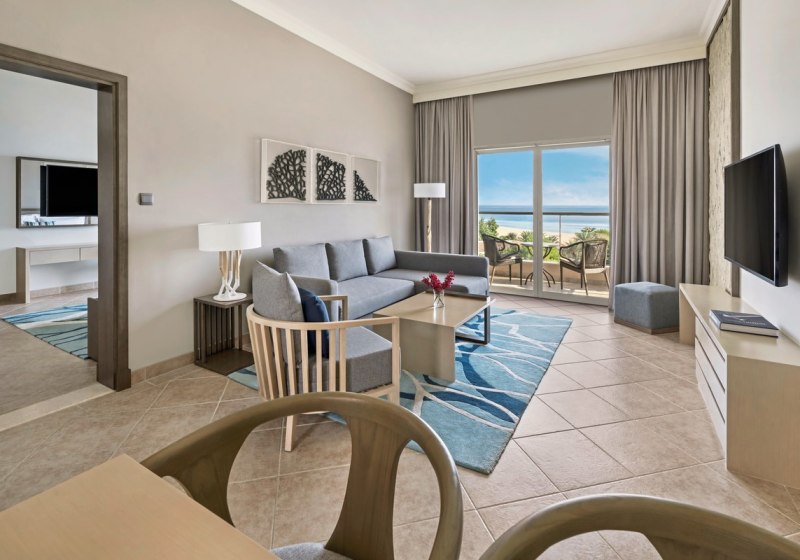 250 Zimmer und Suiten, kostenfreies WLAN im gesamten Resort und durchdachte Services prägen den Aufenthalt. Während die Kinder im Flipper’s Kids Club beschäftigt sind, bestellt Ihr an der Swim-up-Poolbar ein kühles Getränk. Highlight: Direkte Strandlage mit Hajar-Gebirge – Landschaftsbild mit starkem Kontrast.