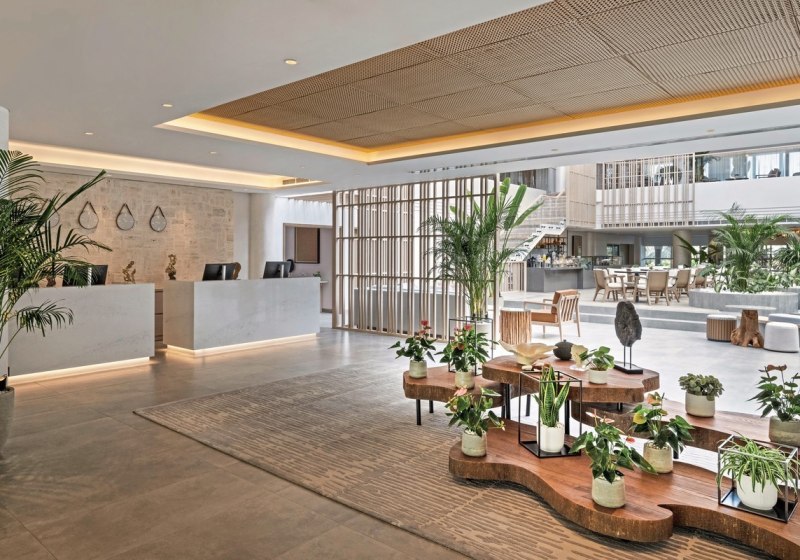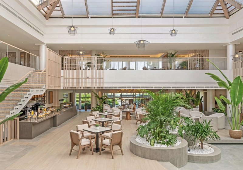 Die öffentlichen Bereiche wirken strukturiert und weitläufig: Rezeption und Lobby gehen in eine tropische Gartenlandschaft über, Wege führen direkt zum Strand. WLAN ist im gesamten Resort kostenfrei. Liegen, Sonnenschirme und Badetücher stehen an Strand und Pool bereit – unkompliziert, klar organisiert.