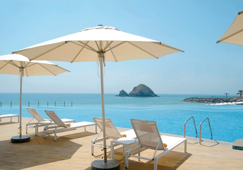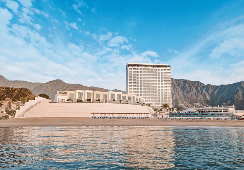 Ihr wohnt in Al Aqah an der Ostküste des Emirats Fujairah, unmittelbar am privaten Sandstrand. Hinter Euch erhebt sich das Hajar-Gebirge, vor Euch liegt das Meer mit Sicht auf Snoopy Island. Bis Dibba sind es etwa 25 km, nach Fujairah Stadt rund 70 km, zum Flughafen Dubai (DXB) ca. 143 km. Die Ozean- und Bergkulisse prägt den Aufenthalt vom Morgenlicht bis zum Sonnenuntergang auf der Ozone Rooftop Bar. Der direkte Strandzugang macht den Weg ins Wasser kurz und unkompliziert, während die Gebirgsfront im Rücken für eine klare, markante Szenerie sorgt. Highlight: Direkter Strandzugang mit markanter Bergkulisse im Rücken.