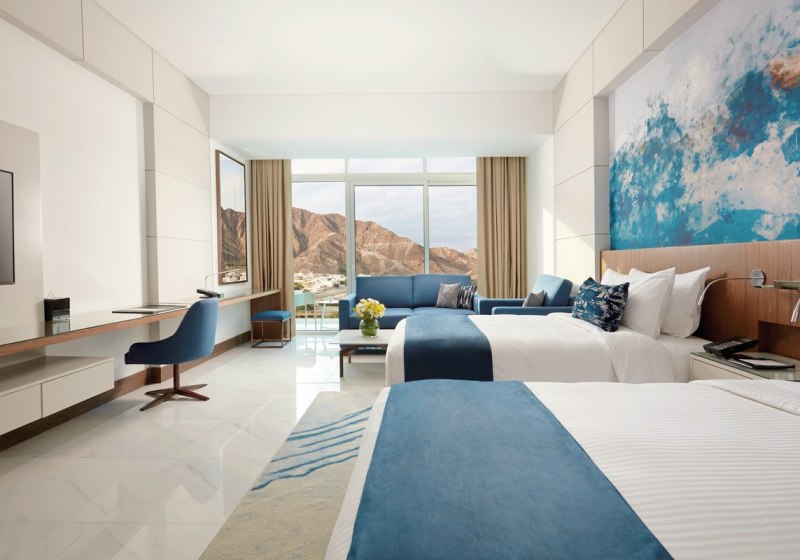 Royal M Al Aqah Beach Resort verbindet direkten Privatstrand, klare Ausblicke auf Snoopy Island und die Kulisse des Hajar-Gebirges mit großzügigen Zimmern und verlässlich gut bewerteten Services. Mehrere Restaurants, die Ozone Rooftop Bar und strukturierte Familienbereiche formen einen stimmigen Tagesablauf in den Ferien.