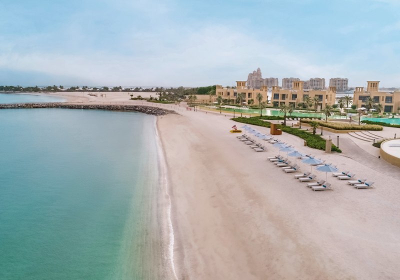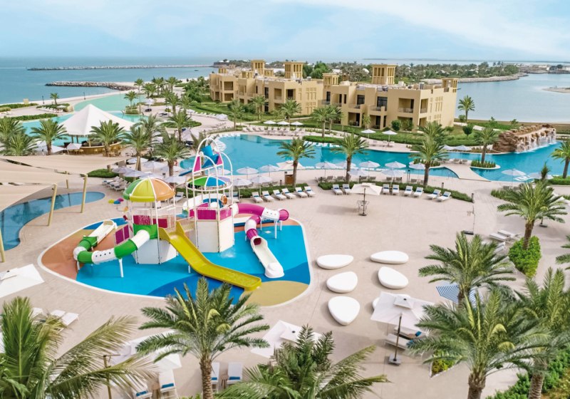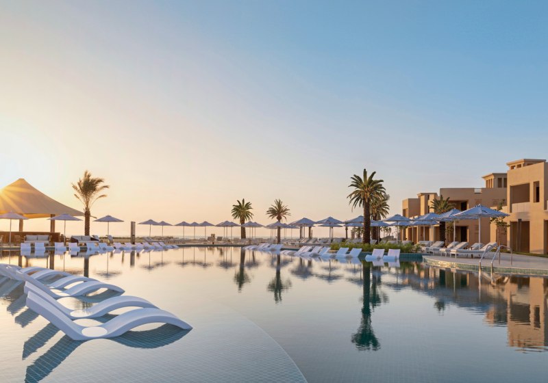 Sofitel Al Hamra Beach Resort empfängt Euch im Stil einer arabischen Festung, eingebettet in eine weitläufige Gartenanlage mit Lagune. Ihr wohnt im Haupthaus oder in Villen und habt direkten Zugang zu einem 650 Meter langen Sandstrand. Die Atmosphäre wirkt ruhig und geordnet, mit klaren Wegen zwischen Strand, Pools und Restaurants.