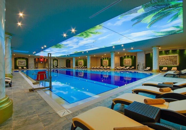 - Wasserwelten: Beheiztes Hallenbad, mehrere Außenpools und großer Aquapark verfügbar.