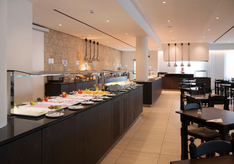 Im Hauptrestaurant esst Ihr bequem innen, begleitet von einem Angebot, das von Frühstück bis Abendessen reicht. Verpflegungsoptionen umfassen Frühstück, Halbpension, Vollpension und All-Inclusive mit alkoholfreien und alkoholischen Getränken sowie Snacks. Vegetarische Kost ist ausgewiesen, sodass Ihr die Tagesplanung frei um Eure Mahlzeiten legt.