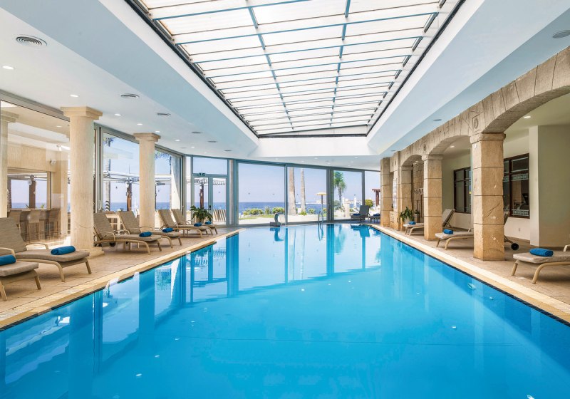 • Liegestühle • Hallenbad • Außenpool • Sonnenschirme • Pool • Poolbar • Sonnenterrasse • Badetücher