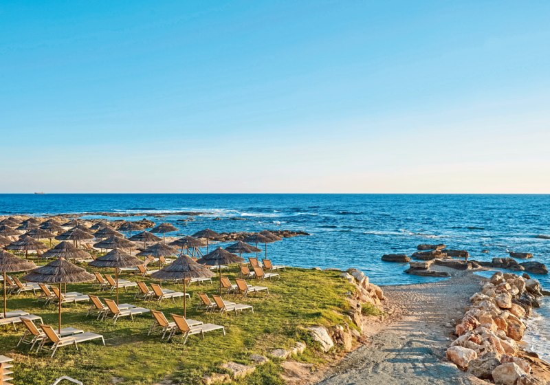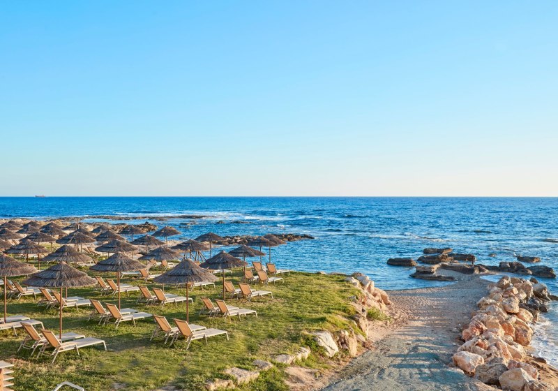 Ihr wohnt direkt am Sandstrand, an der geschützten Bucht von Paphos. Nach Paphos Stadt sind es 12 Kilometer, der Flughafen liegt in etwa 25 Kilometern Entfernung. Eine Bushaltestelle befindet sich unmittelbar vor dem Hotel. So bleibt Ihr flexibel zwischen Strandstunden, Ausflügen in die Stadt und entspannter Rückkehr in die ruhige Küstenlage.