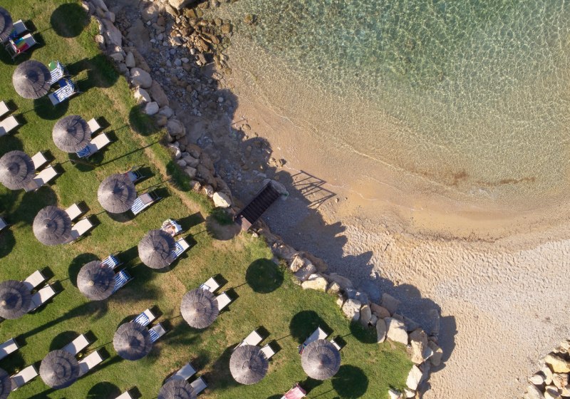 - Strandliegen: Liegen und Schirme stehen am Strandabschnitt bereit.