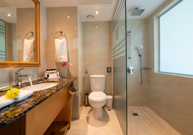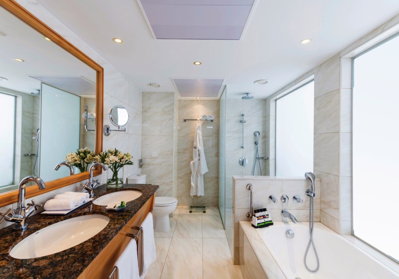 - Komfortbad: Regendusche, Bademantel, Slipper und Kosmetikspiegel.