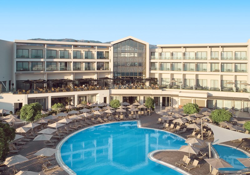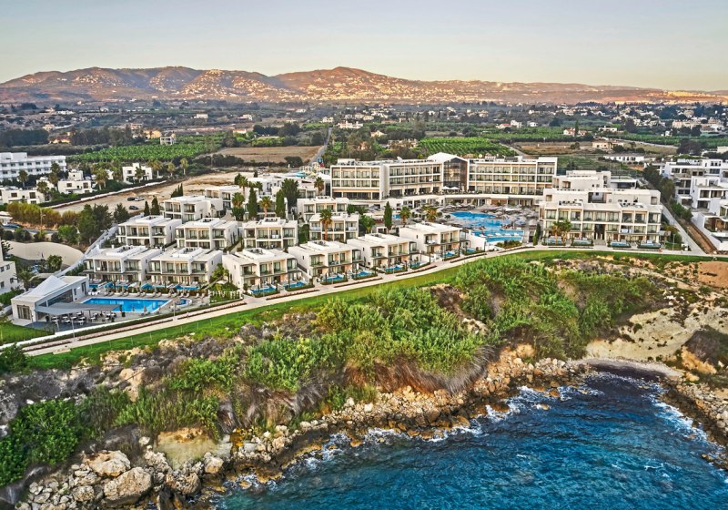 Im Mare Paphos wohnt Ihr unmittelbar an der Mittelmeerküste von Kissonerga, mit einer fußläufig erreichbaren Badebucht und weitem Blick auf das Wasser. Die Anlage wurde 2020 eröffnet und wirkt entsprechend gepflegt und klar strukturiert. Vier Außenpools, ein eigener Wasserpark und weitläufige Sonnenterrassen schaffen Raum für entspannte Stunden, während das Aktivprogramm den Tag angenehm strukturiert. Familien finden altersgerechte Angebote, Paare schätzen die ruhige Küstenlage und die Auswahl an Restaurants und Bars.
